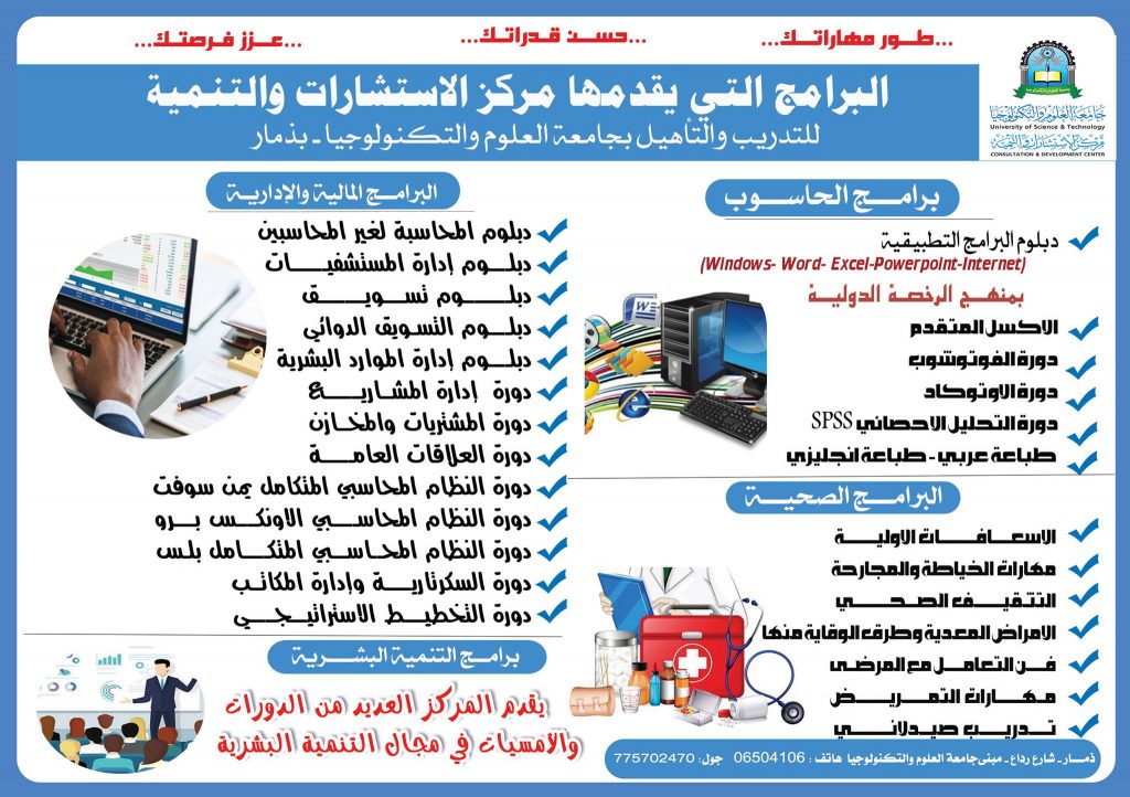 التحق الآن ببرامج مركز الاستشارات والتنمية بجامعة العلوم والتكنولوجيا- ذمار معنا … طور مهاراتك – حسن قدراتك –…