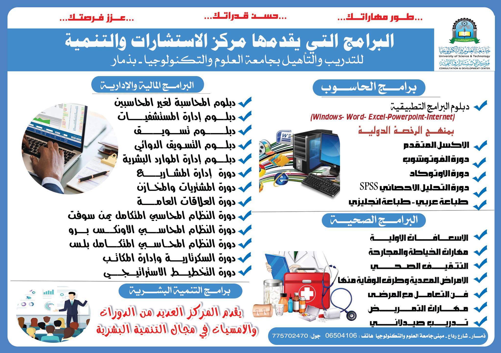 التحق الآن ببرامج مركز الاستشارات والتنمية بجامعة العلوم والتكنولوجيا- ذمار معنا … طور مهاراتك – حسن قدراتك – عزز فرصك