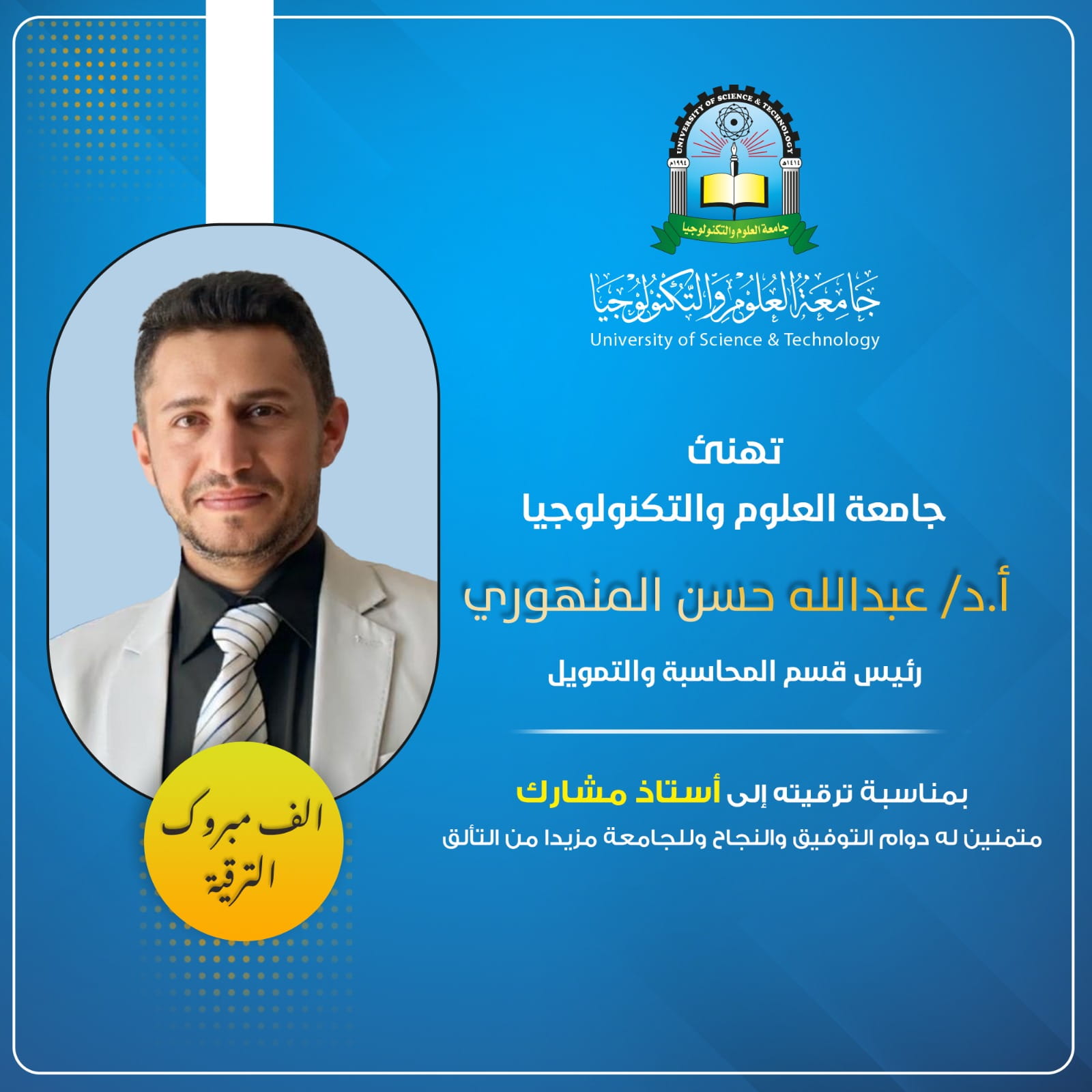 تتقدم جامعة العلوم والتكنولوجيا بأجمل التهاني والتبريكات لـلدكتور/ عبدالله المنهوري (رئيس قسم المحاسبة والتمويل)، بمناسبة ترقيته إلى درجة أستاذ مشارك. نفع الله به وبعلمه، ومزيداً من التألق والنجاح…