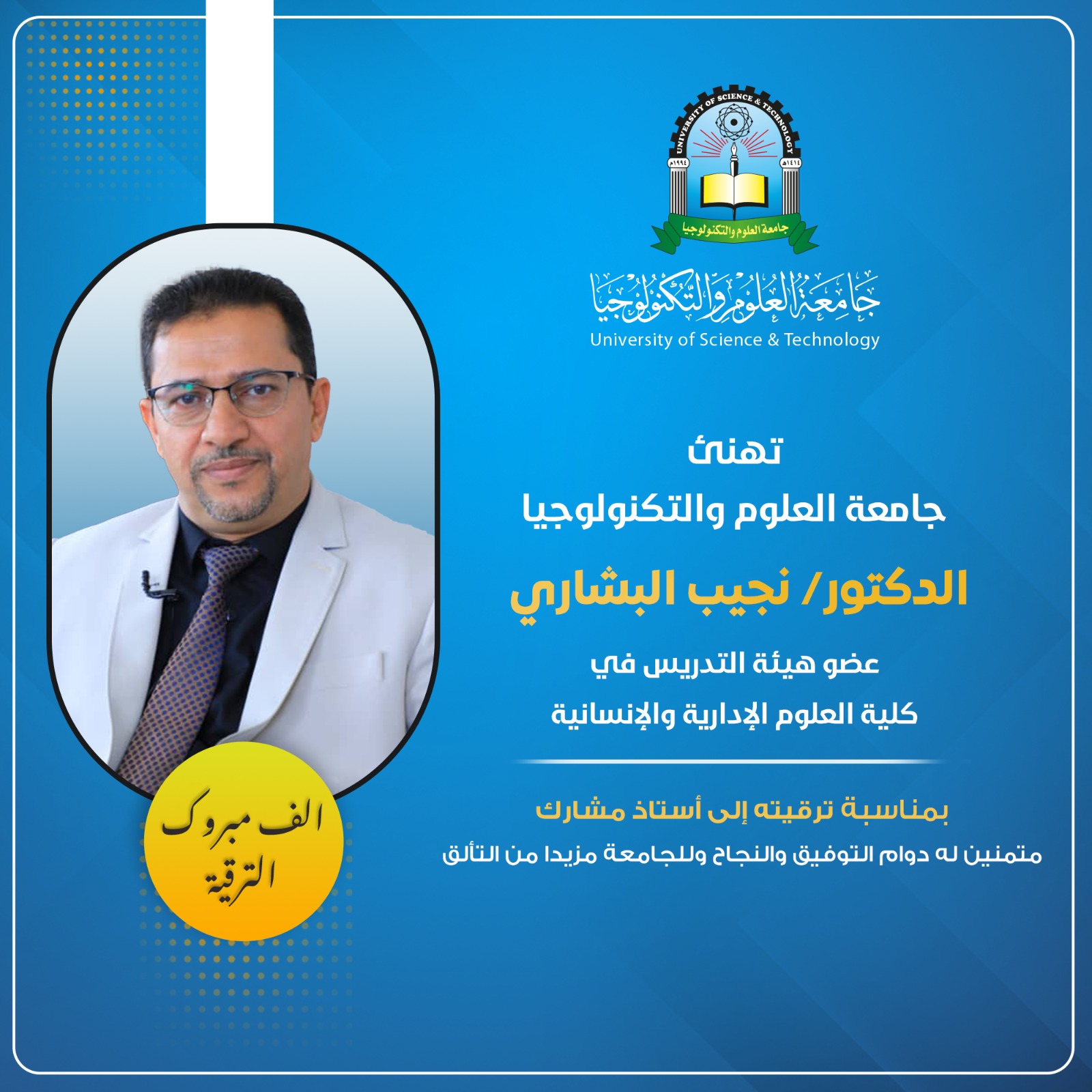 تتقدم جامعة العلوم والتكنولوجيا بأجمل التهاني والتبريكات لـلدكتور/ نجيب البشاري (عضو هيئة التدريس في كلية العلوم الإدارية و الإنسانية )، بمناسبة ترقيته إلى درجة أستاذ مشارك. نفع الله…