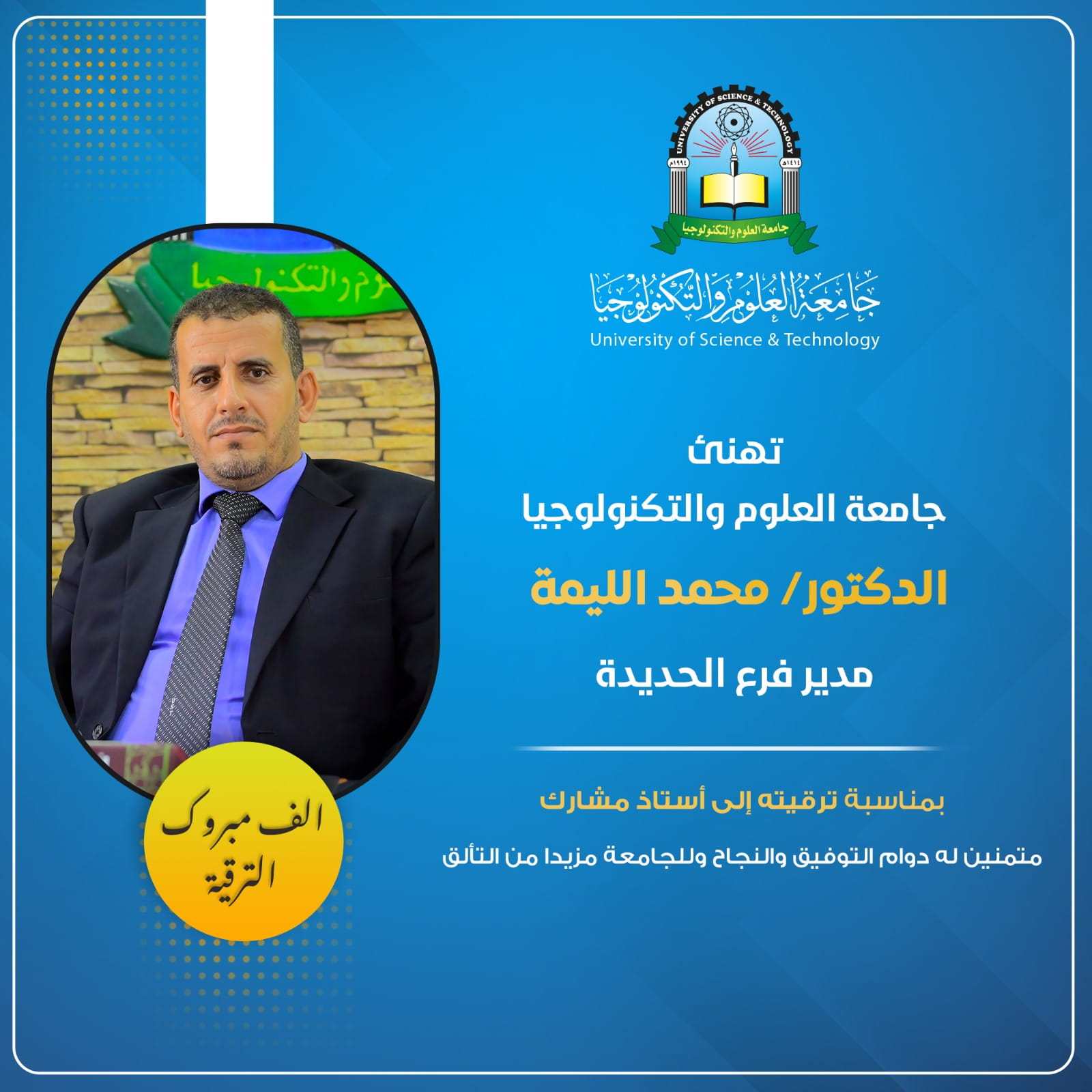 تتقدم جامعة العلوم والتكنولوجيا بأجمل التهاني والتبريكات لـلدكتور محمد الليمة (مدير فرع الحديدة )، بمناسبة ترقيته إلى درجة أستاذ مشارك. نفع الله به وبعلمه، ومزيداً من التألق والنجاح…