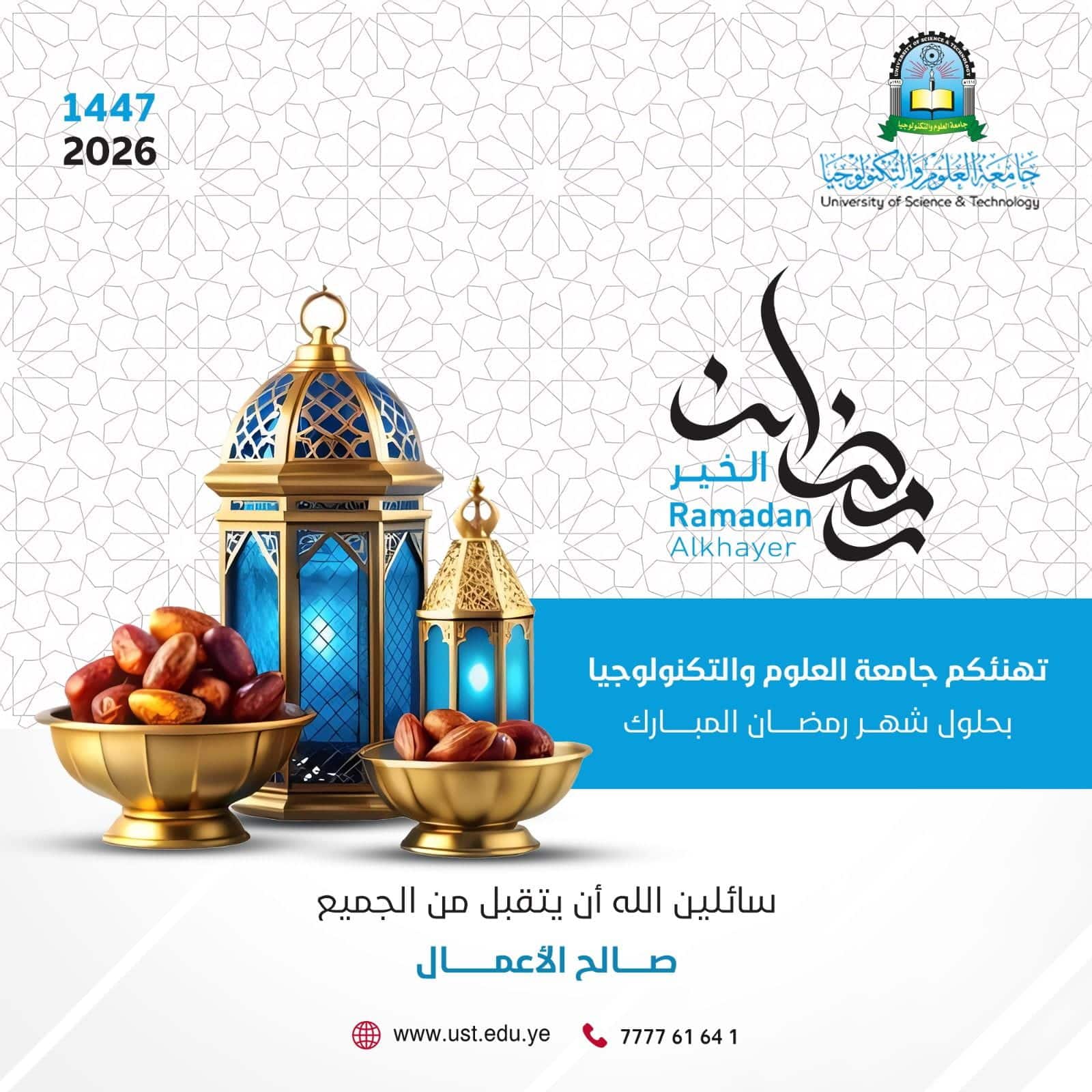 مبارك عليكم الشهر تهنئكم جامعة العلوم والتكنولوجيا بحلول شهر رمضان المبارك. نسأل الله أن يتقبل منا ومنكم صالح الأعمال، وأن يجعله شهر خير وبركة على الجميع. كل عام وأنتم بخير!