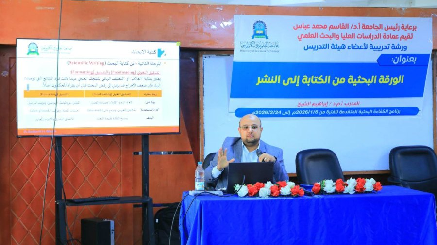 نظّمت عمادة الدراسات العليا والبحث العلمي بجامعة العلوم والتكنولوجيا بصنعاء، اليوم، ورشة تدريبية لأعضاء هيئة التدريس ( المجموعة الأولى ) بعنوان: “الورقة البحثية من الكتابة إلى النشر”، قدّمها أ.م.د إبراهيم الشيخ عميد الدراسات العليا والبحث العلمي، وذلك ضمن برنامج الكفاءة البحثية المتقدمة الذي تنظمه العمادة لتعزيز مهارات الكادر الأكاديمي في المجال البحثي.