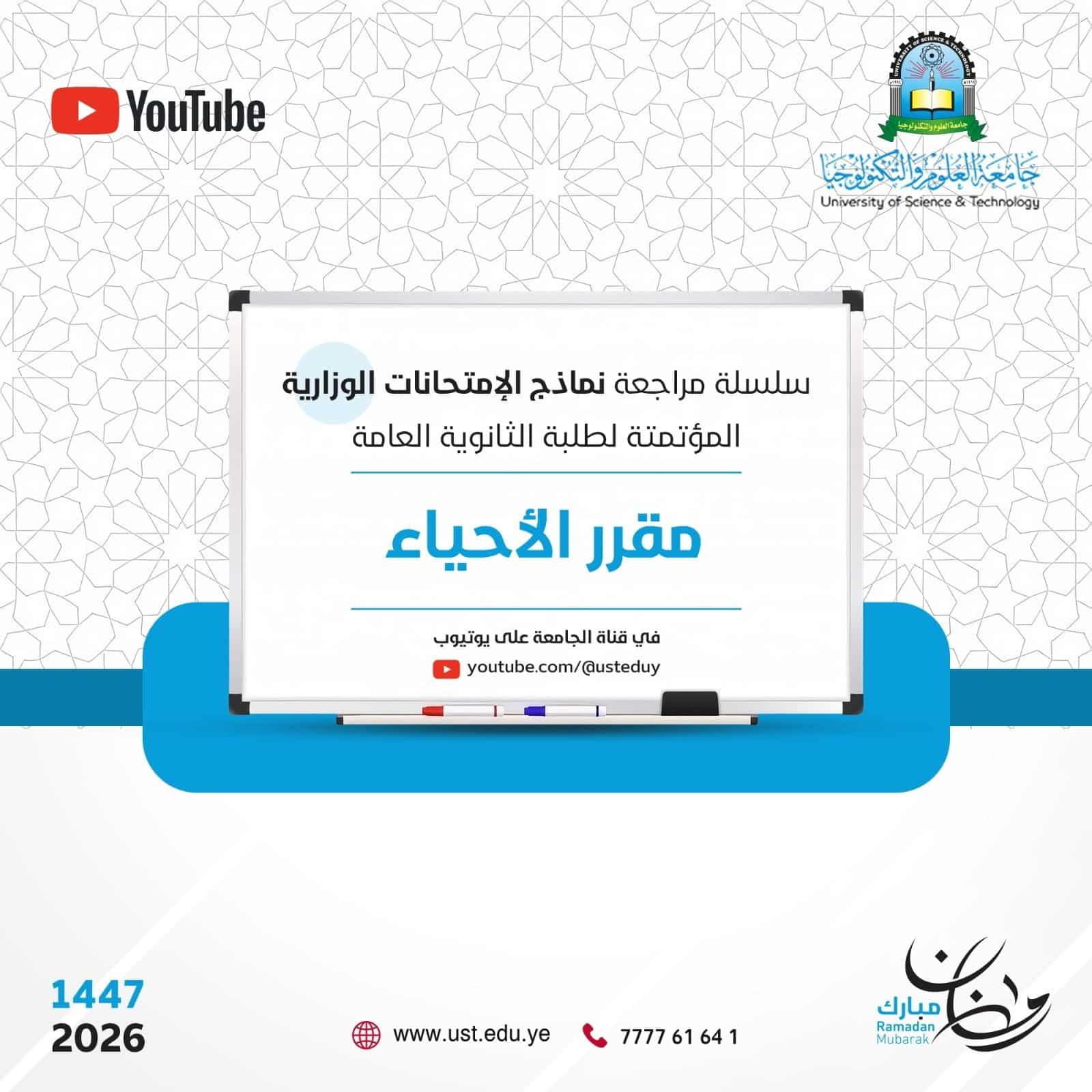 هدية جامعة العلوم والتكنولوجيا لطلبة الثانوية العامة المقبلين على الإمتحانات الوزارية روابط حلقات مراجعة نماذج الإمتحانات الوزارية المؤتمتة لمادة الأحياء للصف الثالث ثانوي الحلقة الأولى: https://youtu.be/A7cjXEiGKsg?si=pmSTzq-34AMLjwx- الحلقة الثانية : https://youtu.be/jYkmMAjlmzY?si=0xCGEW2veYHOd5iH الحلقة الثالثة : https://youtu.be/jYkmMAjlmzY?si=0xCGEW2veYHOd5iH الحلقة الرابعة : https://youtu.be/29Ml3fxCh3M?si=658IyxMAWn86iGKK الحلقة الخامسة : https://youtu.be/rwAgMkCkoBg?si=Gd88ULPxOChnW9Y7 الحلقة السادسة : https://youtu.be/KhIHN5izQYw?si=t90GGKww6Qzfak5i الحلقة السابعة : https://youtu.be/1e9XTjdxHwE?si=OjkCTXUdsSCQx6UG الحلقة الثامنة : https://youtu.be/nA7xDa27s9k?si=5i4QKOZ2JHJU5HJB الحلقة التاسعة : https://youtu.be/czEmzumiNvE?si=xg6H2GKmp4GtiF2d الحلقة العاشرة : https://youtu.be/QZDnjJeUsFU?si=Uv2Hj6XPtmJz1v54 #جامعة_العلوم_والتكنولوجيا الطريق إلى مستقبل أفضل