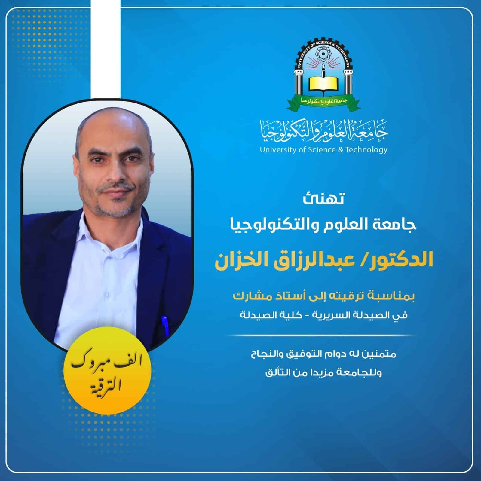 تتقدم جامعة العلوم والتكنولوجيا بأجمل التهاني والتبريكات لـلدكتور عبدالرزاق الخزان بمناسبة ترقيته إلى درجة أستاذ مشارك في الصيدلة السريرية. نفع الله به وبعلمه، ومزيداً من التألق والنجاح في مسيرته العلمية والمهنية.