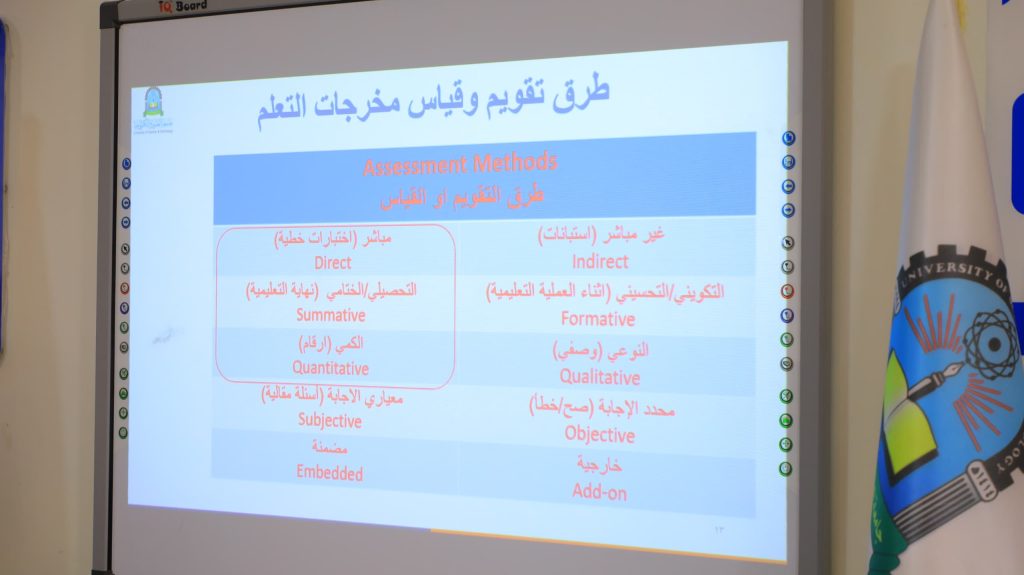 استهدفت الورشة التي يقدمها أ.د محمد الشرجبي، أعضاء هيئة التدريس في كلية الهندسة، وركّزت على آليات قياس وتقويم مخرجات التعلم، وتوظيف النتائج في تطوير المحتوى وأساليب التدريس، بما يتوافق مع متطلبات الاعتماد الأكاديمي ABET.