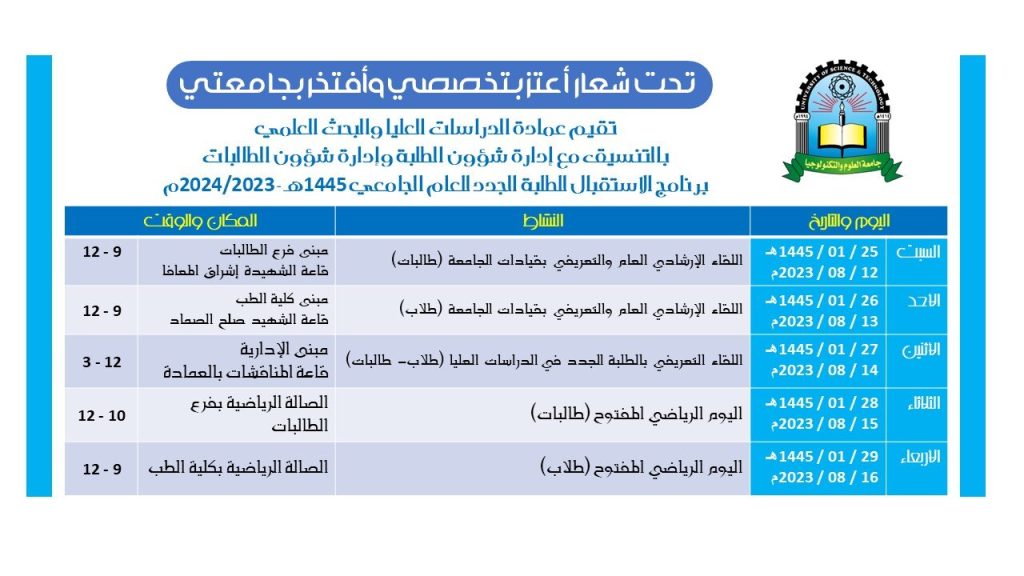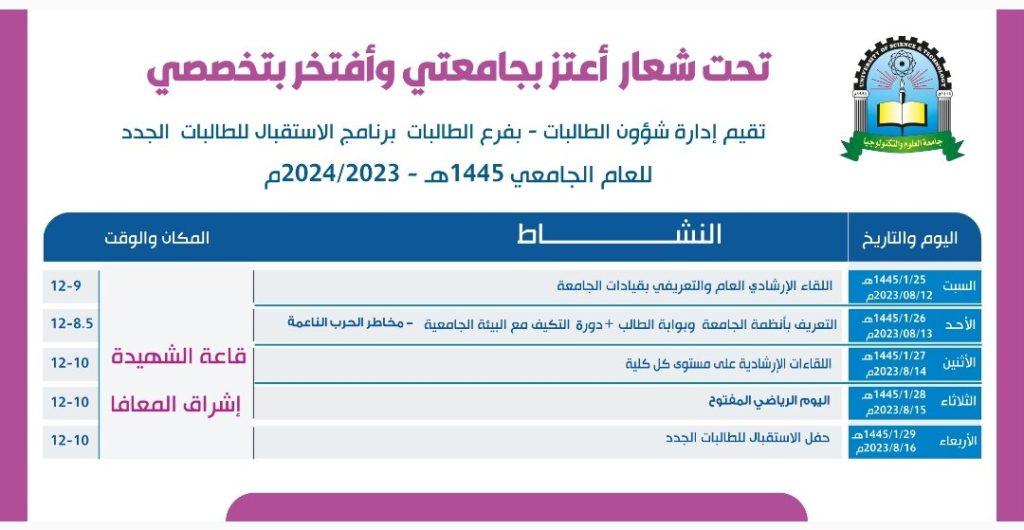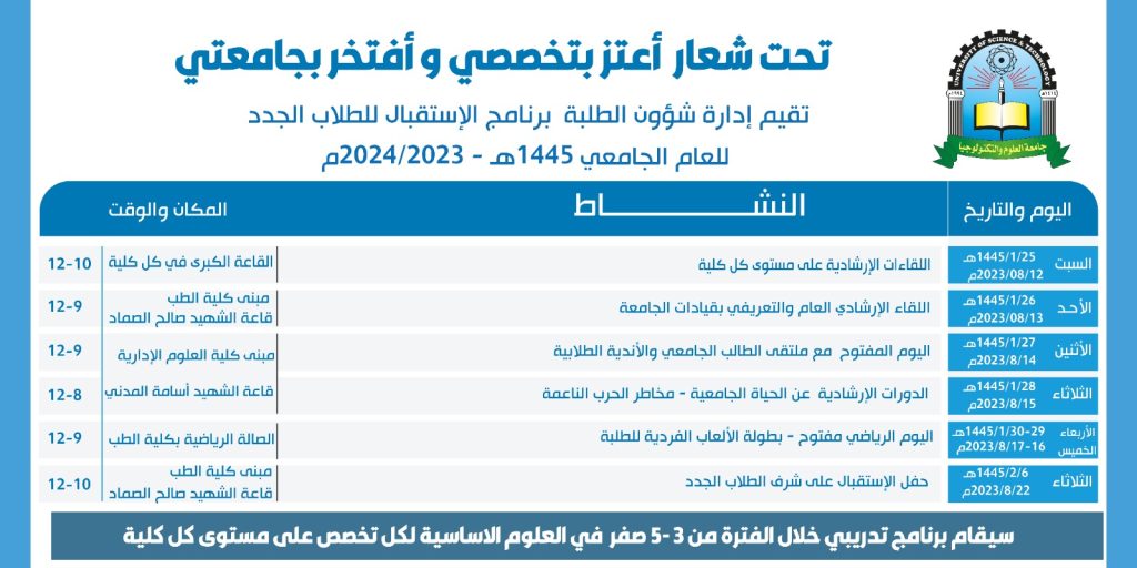 ضمن فعاليات برنامج إستقبال الطلاب الجدد للعام الجامعي 1445هـ 2023-2024م تقيم جامعة العلوم والتكنولوجيا وملتقى الطالب الجامعي ”…