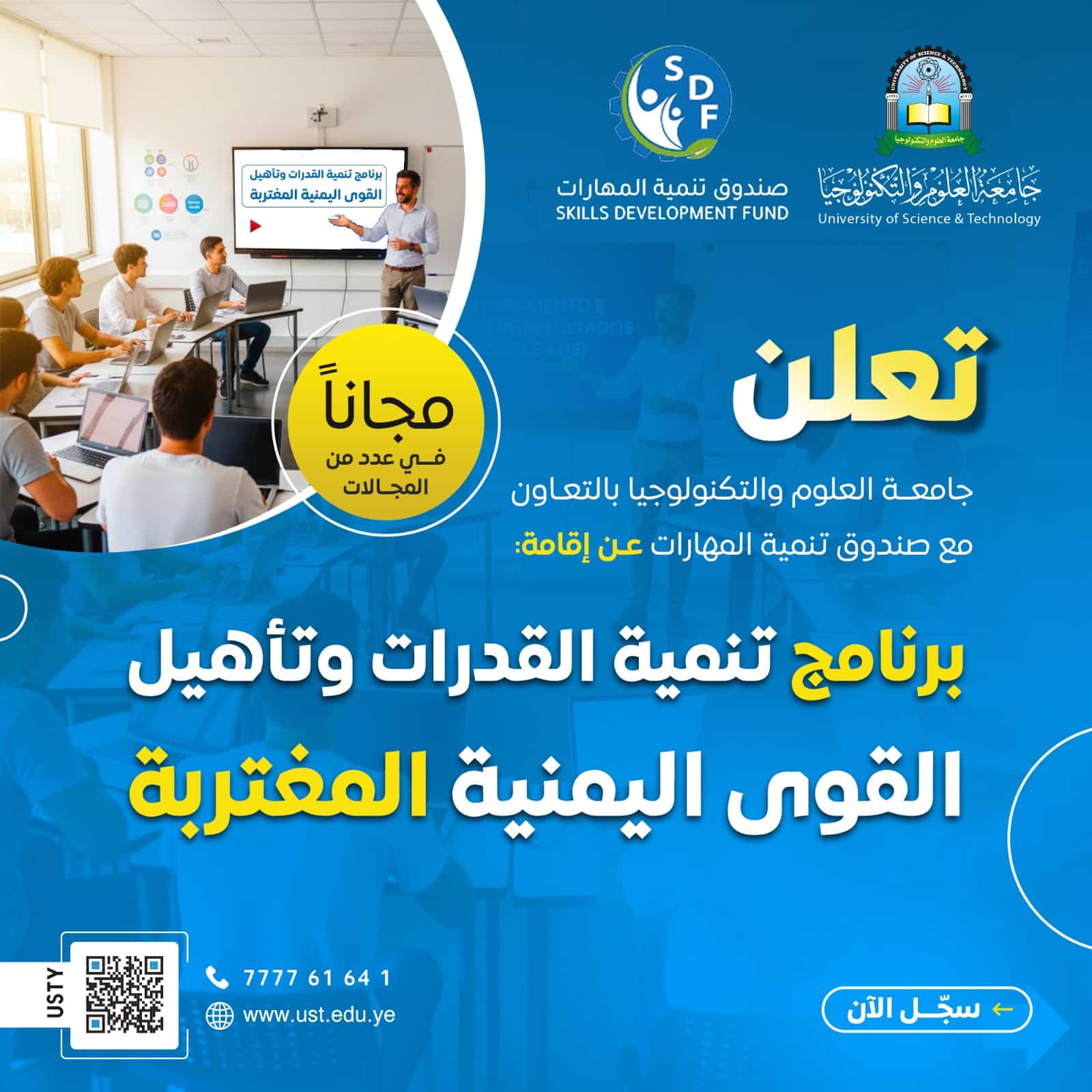 (مجاااانا) تعلن جامعة العلوم والتكنولوجيا بالتعاون مع صندوق تنمية المهارات عن إقامة (برنامج تنمية القدرات وتأهيل القوى اليمنية المغتربة) مجانا في مختلف المجالات التقنية والمعرفية والتخصصية وذلك بهدف…