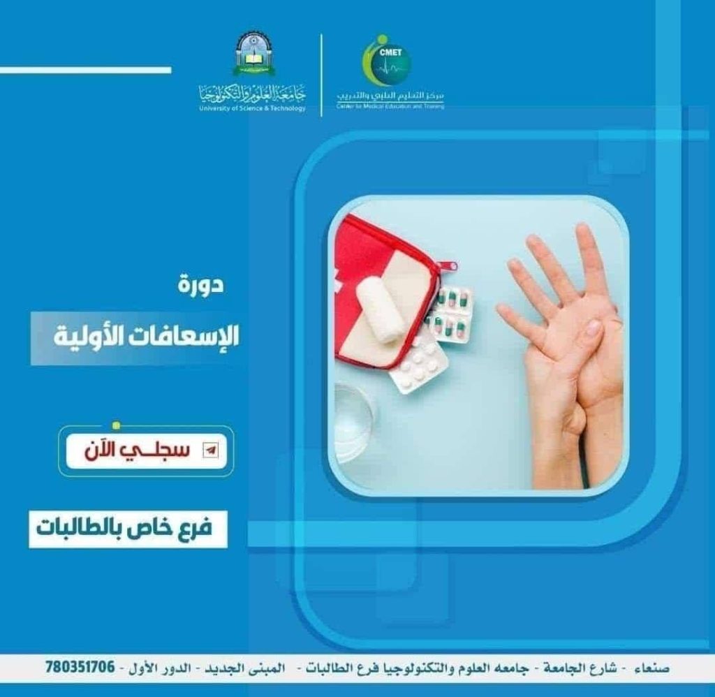 مركز التعليم الطبي والتدريب – بجامعة العلوم والتكنولوجيا فرع الطالبات يعلن عن بدء دورة الإسعافات الأولية. 📅 وقت…