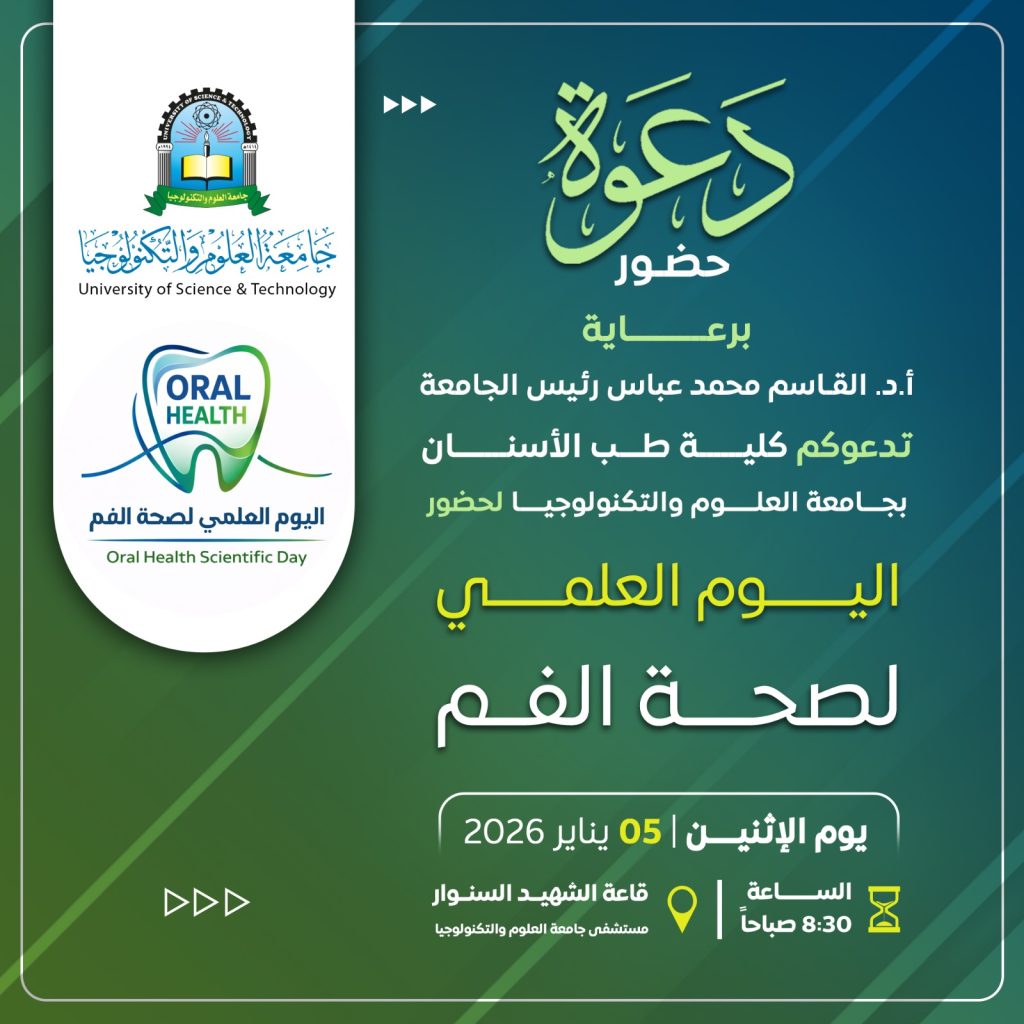 برعاية أ.د. القسم محمد عباس رئيس جامعة العلوم والتكنولوجيا تٌقيم كلية طب الأسنان فعالية ” اليوم العلمي لصحة…