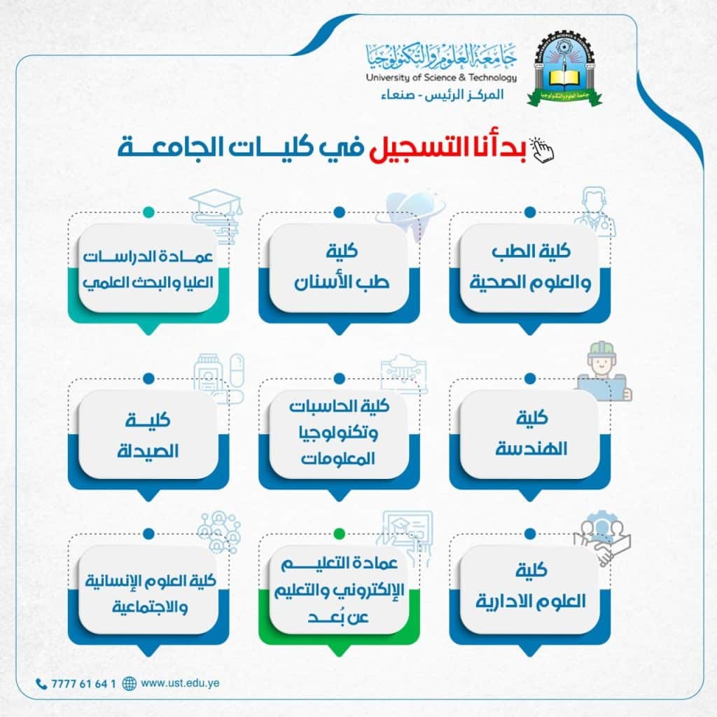 بدأنا التسجيل في جميع كليات جامعة العلوم والتكنولوجيا المركز الرئيسي صنعاء🎓 🏷 عمادة الدراسات العليا والبحث العلمي. 🏷 كلية الطب…