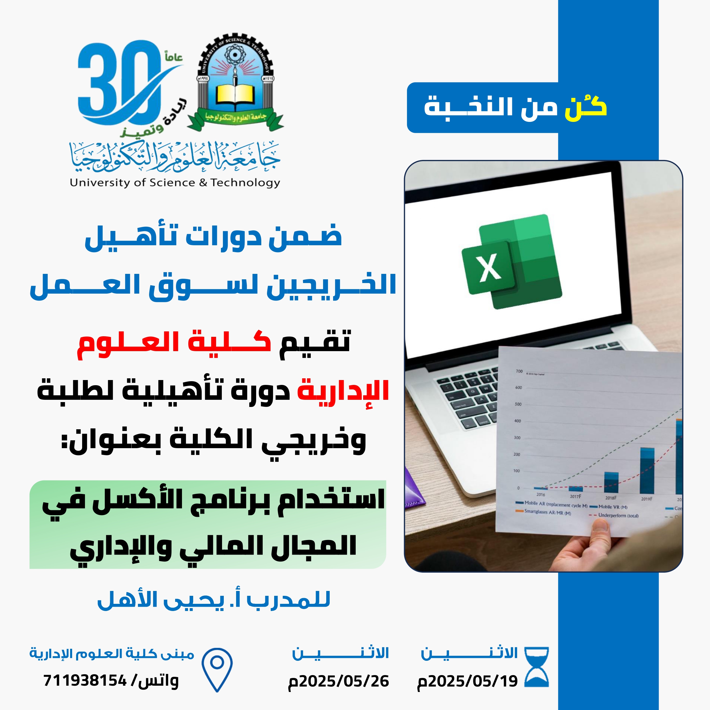 📊 طوّر مهاراتك وابدأ طريقك نحو الاحتراف! هل تعلم أن الإلمام بـ Excel لم يعد مجرد ميزة… بل مطلب أساسي في عالم المال والأعمال؟ 💼 📌 كلية العلوم…