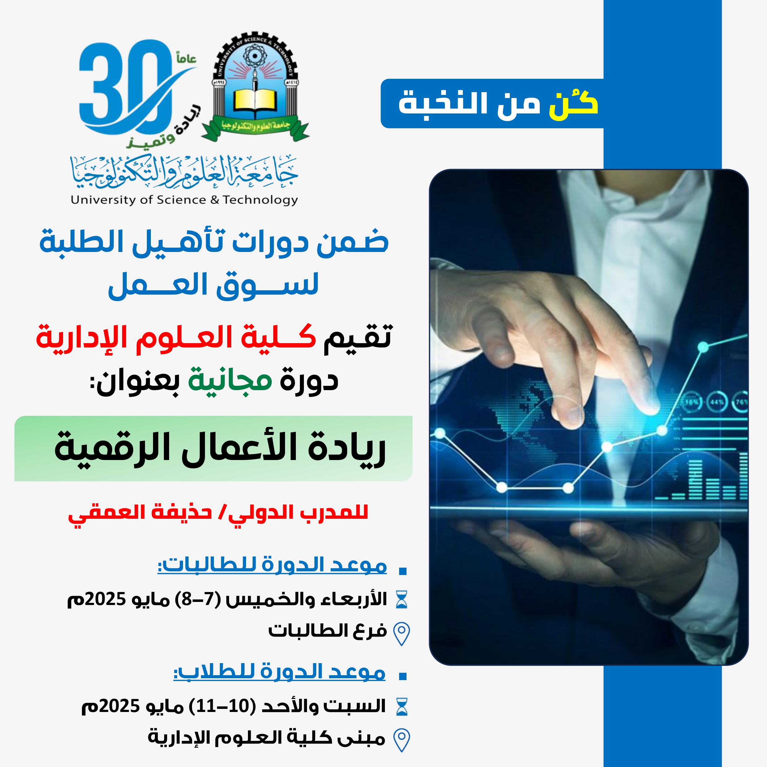 🎓ضمن احتفالات الجامعة بمرور 30 عاما على تأسيسها، تقيم كلية العلوم الإدارية دورة تدريبية لخريجي الثانوية العامة وطلبة الجامعة بعنوان:  “مهارات التسويق الالكتروني“ 🔹مع المدرب م. محمد قدحة🔹…