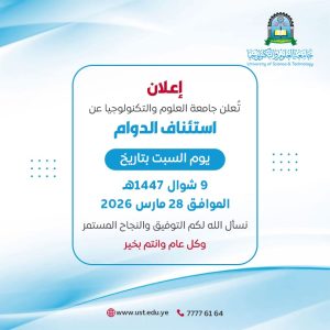 مواقع جامعة العلوم والتكنولوجيا > كلية العلوم الانسانية والاجتماعية > Events > اعلانات كلية العلوم الانسانية والاجتماعية > إستئناف الدوام