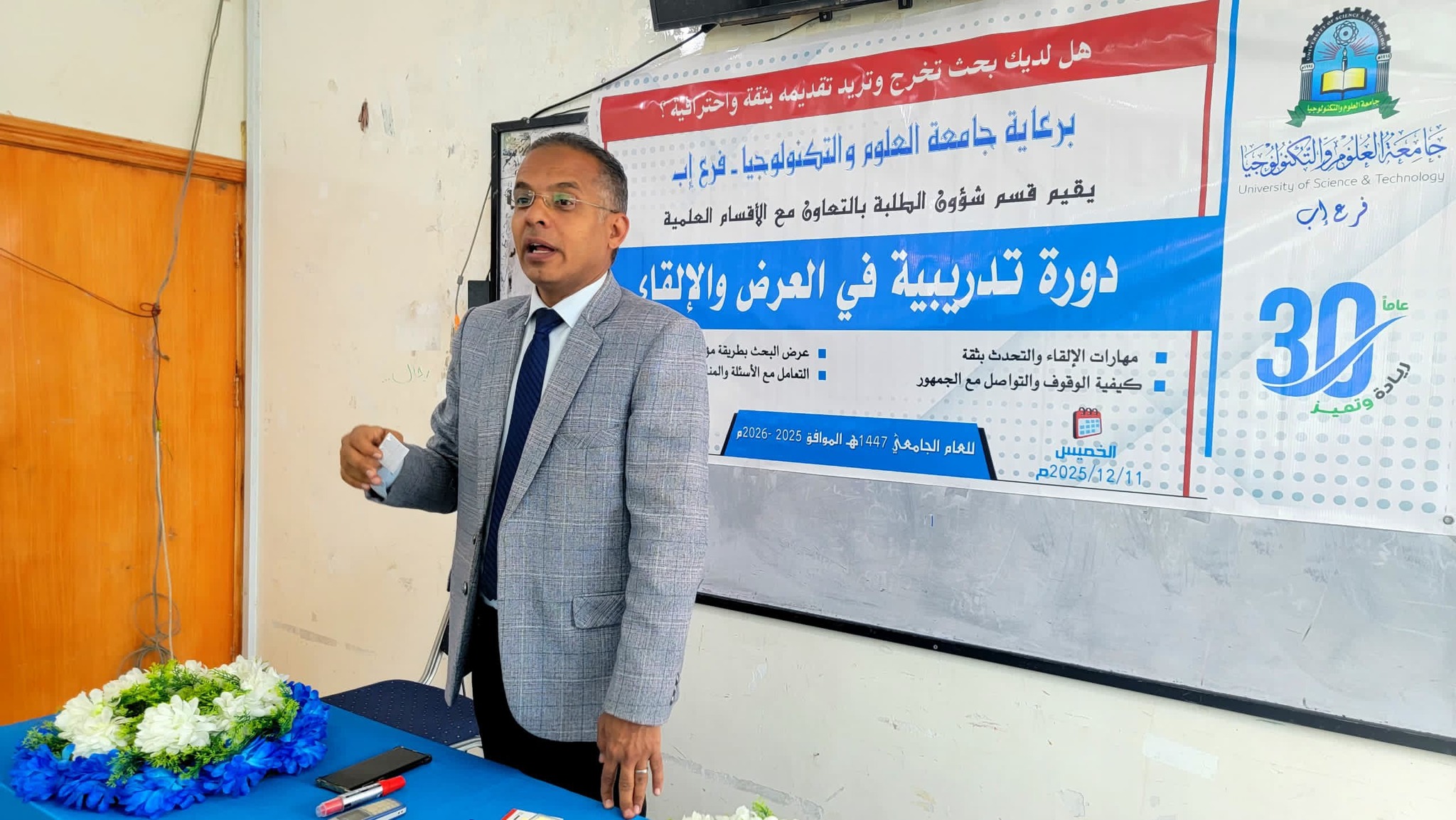 قسم شؤون الطلبة ينظم دورة حول العرض والإلقاء بحرفية وثقة عالية بجامعة العلوم والتكنولوجيا-إب برعاية إدارة جامعة العلوم والتكنولوجيا فرع إب، نظم قسم شؤون الطلبة دورة بعنوان “العرض…