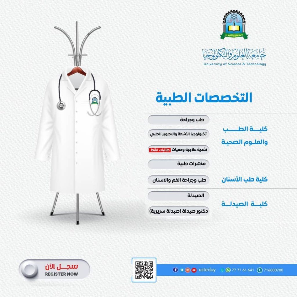 التسجيل مفتوح في البرامج الطبية بجامعة العلوم والتكنولوجيا 🎓 كلية الطب والعلوم الصحية: 👨⚕️ طب وجراحة 🥗 تغذية…
