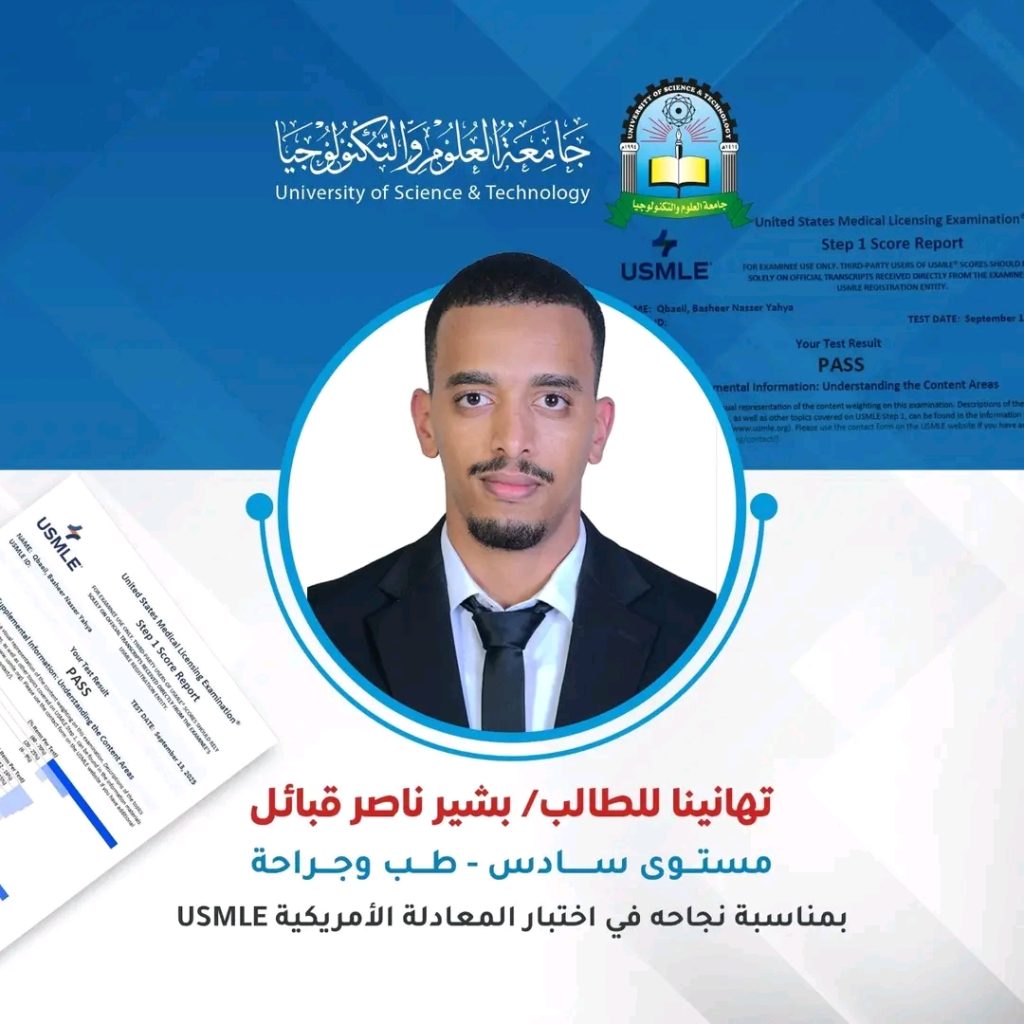 تتقدّم كلية الطب والعلوم الصحية بأحرّ التهاني والتبريكات للطالب بشير ناصر قبائل – مستوى سادس طب وجراحة –…