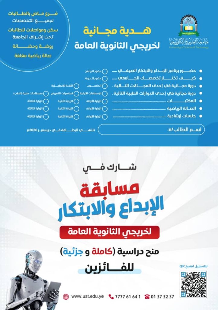 التسجيل مفتوح في جامعة العلوم والتكنولوجيا المركز الرئيسي ـ صنعاء وفروعه (إب، تعز الحوبان، الحديدة) حيث ينتظرك عالم…