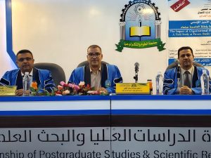 وتكونت لجنة المناقشة من أ.د محمد عبدالله سرحان الكهالي أستاذ إدارة الأعمال المشارك بالجامعة الأماراتية المحكم الخارجي رئيساً و د. نجيب محمد يحيى البشاري أستاذ إدارة الأعمال المساعد بجامعة العلوم والتكنولوجيا المشرف على الباحثة عضواً، ود. بسام علي احمد مسلم أستاذ إدارة الأعمال المساعد بجامعة العلوم والتكنولوجيا المحكم الداخلي عضواً ً.