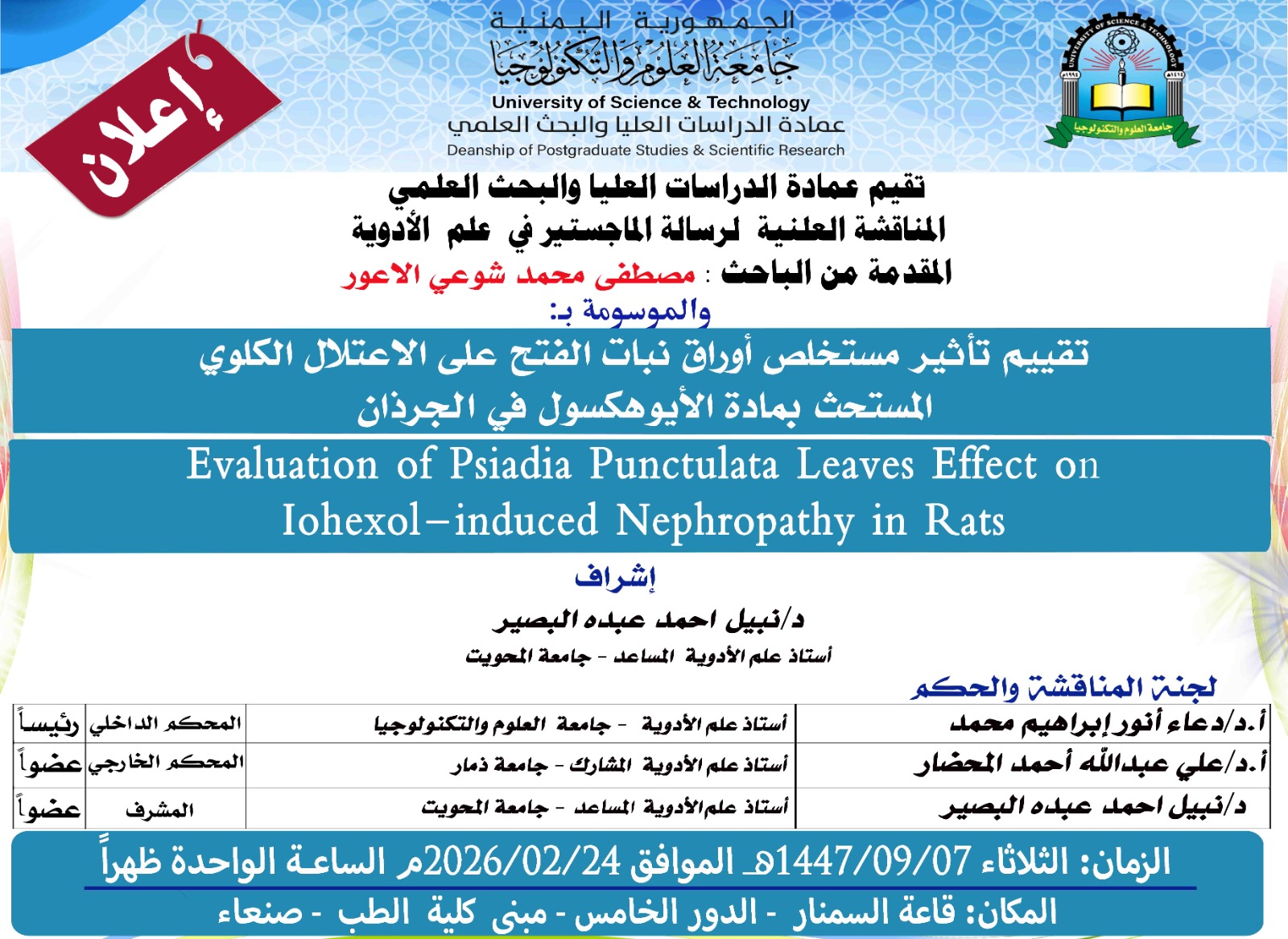المناقشة العلنية لرسالة الماجستير في علم الأدوية للباحث اكرم صالح علي الغبسي في عمادة الدراسات العليا والبحث العلمي 14 فبراير، 2026 المناقشة العلنية لرسالة الماجستير في علم الأدوية للباحث اكرم صالح علي الغبسي في عمادة الدراسات العليا والبحث العلمي Views: 8 Read More