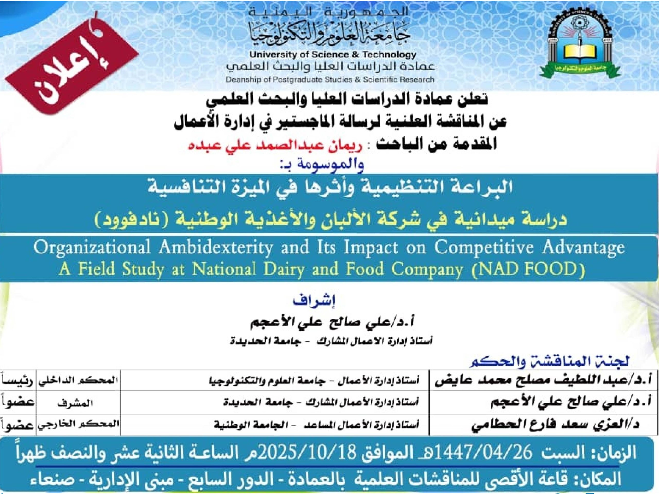 المناقشة العلنية لرسالة الماجستير في إدارة الأعمال في عمادة الدراسات العليا والبحث العلمي