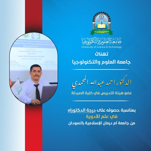 تتقدم كلية الصيدلة بجامعة العلوم والتكنولوجيا بأسمى آيات التهاني للدكتور أحمد عبدالله المحمدي عضو هيئة التدريس بكلية الصيدلة بمناسبة حصوله على الدكتوراه في علم الأدوية من جامعة أم…
