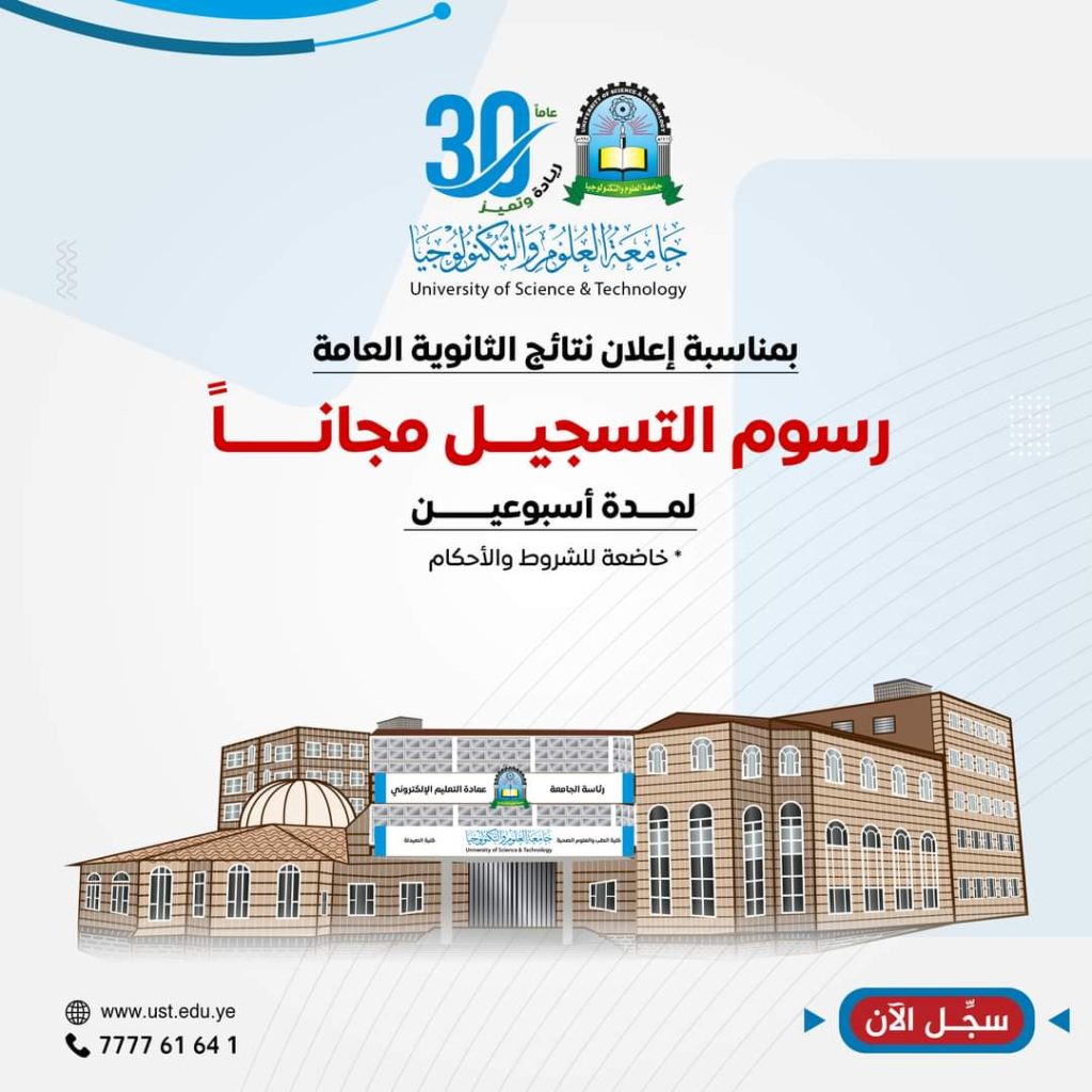مبارك للناجحين في الثانوية العامة 🎉🎓 وبهذه المناسبة، تعلن جامعة العلوم والتكنولوجيا عن إعفاء كامل من رسوم التسجيل…